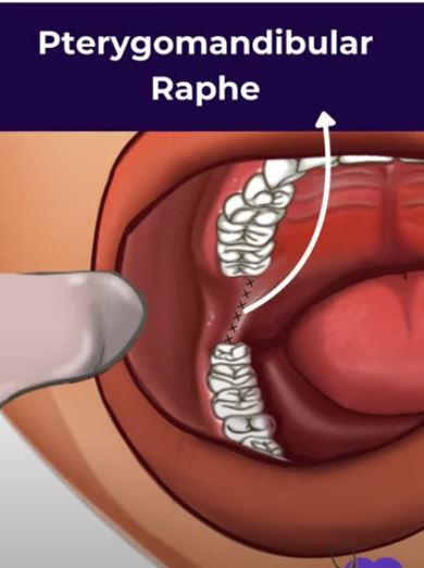Raphe (the pterybomandibular raphye) was the topic of an ongoing conversation. And, while putting on her gloves, my osteopath asked me to show her exactly where on my left pterygomandiulbar raphe the ‘sharp’ sensation was located. She palpated both the right and left raphes; returning to the left side, with eyes as big as saucers, she exclaimed: “There’s a tear or indentation in the raphe!”