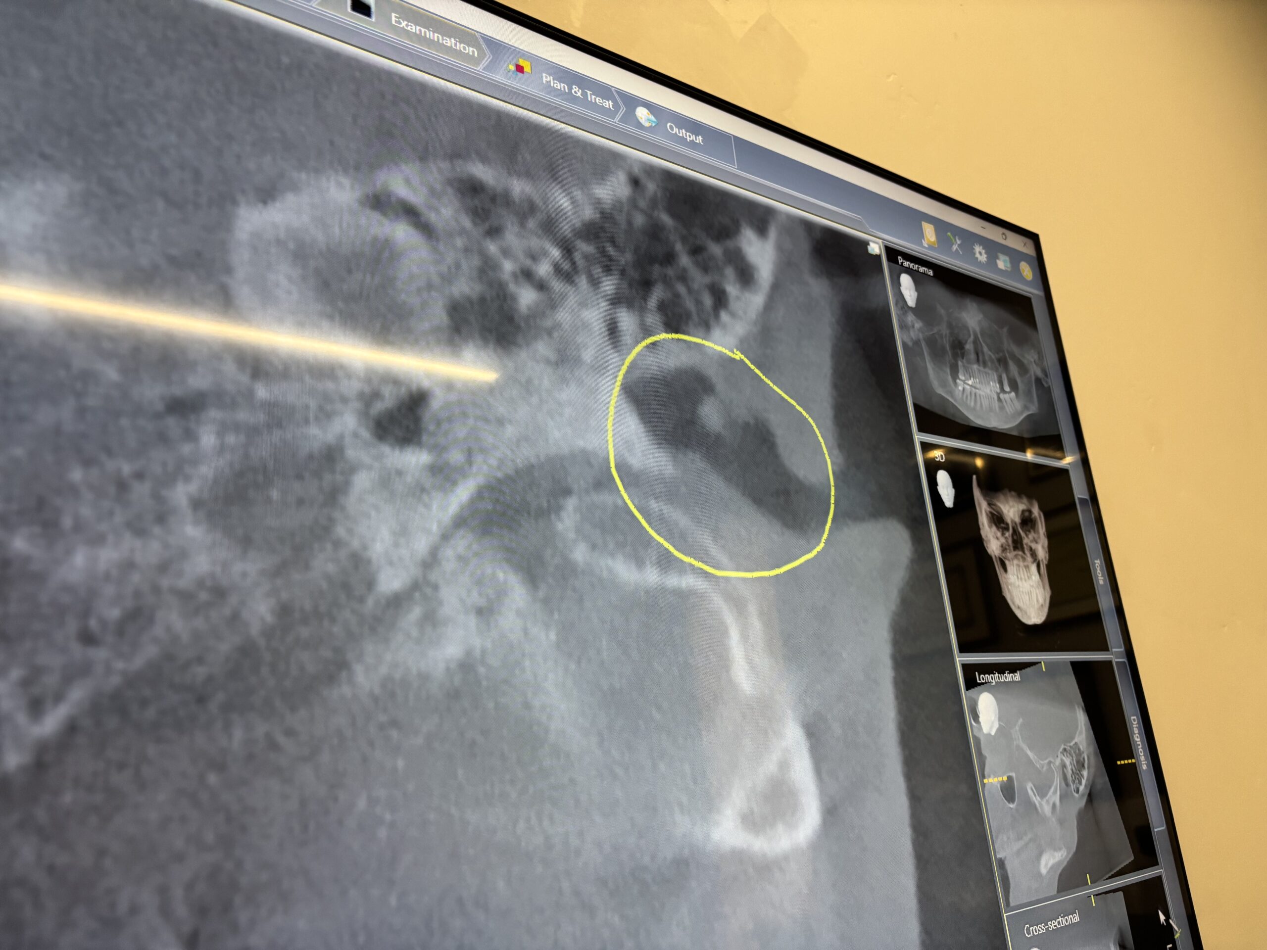 The big-screen TV displaying the CBCT scan is